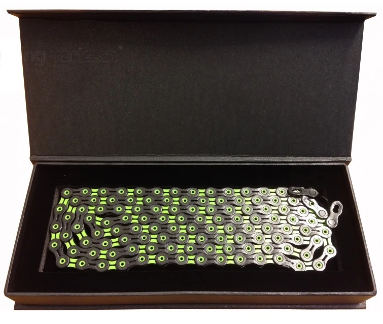 Lieferumfang: Kette KMC DLC11 schwarz/grĂĽn inklusive Missing Link Kettenschloss