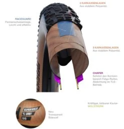In keiner anderen Disziplin liegt der Fokus so extrem auf Rollwiderstand und Gewicht wie im Cross Country und Marathon Wettkampfeinsatz. Mit der neuen Super Race Konstruktion setzen wir darĂĽber hinaus noch MaĂźstäbe in der Geschmeidigkeit – keine andere Karkasse gleitet so seidig ĂĽber den Untergrund und sorgt dadurch fĂĽr Traktion wie Super Race. Die patentierte Turn-up Konstruktion zeichnet sich durch einen auĂźerordentlich leichten und geschmeidigen Materialmix aus. Dabei wird die Lauffläche durch eine leichte Schutzeinlage und zwei Karkassenlagen geschĂĽtzt. Die Seitenwände werden durch drei Karkassenlagen vor Schnitten und Snakebites bewahrt. Tubeless Easy.