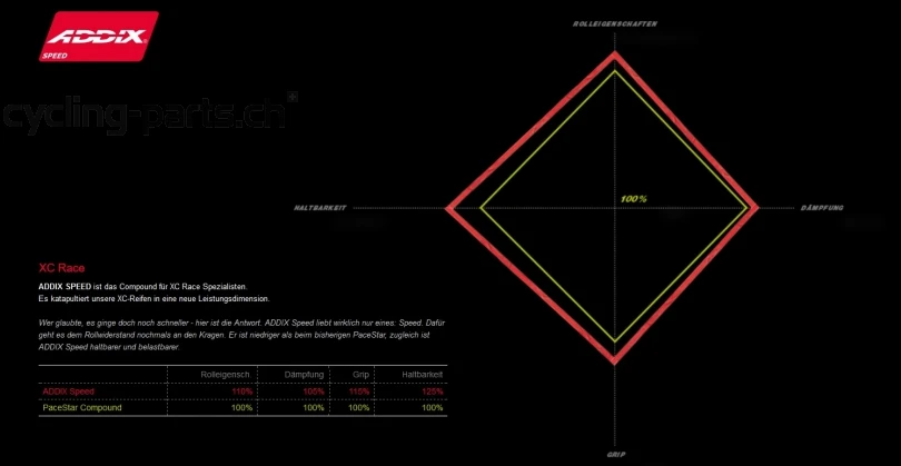 Ist das Compound fĂĽr XC Race Spezialisten. Es katapultiert unsere XC-Reifen in eine neue Leistungsdimension. Wer glaubte, es ginge doch noch schneller – hier ist die Antwort. ADDIX Speed liebt wirklich nur eines: Speed. DafĂĽr geht es dem Rollwiderstand nochmals an den Kragen. Er ist niedriger als beim bisherigen PaceStar, zugleich ist ADDIX Speed haltbarer und belastbarer.