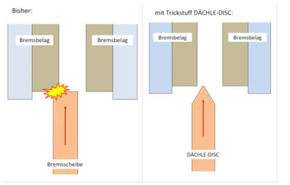 Wer kennt das nicht: Erst ein ärgerlicher Defekt und dann will sich das Laufrad (vor allem das Hinterrad) partout nicht montieren lassen. Grund: Die rechteckige Außenkante der Bremsscheibe kollidiert mit der rechteckigen Unterkante der Bremsbeläge (siehe Abbildung). Man fummelt, verliert Zeit und Nerven. Vater des Gedankens war der immer wieder von Rennfahrern vorgetragene Wunsch, eine Bremsscheibe mit Fase, einer dachförmigen Anschrägung des äußeren Umfangs der Scheibe, zu bekommen. Ziel: Das Laufrad nach Behebung eines Defektes so schnell und unkompliziert wie nur möglich wieder montieren zu können. Durch ihre abgerundete Grad-Fase am äußeren Umfang gleitet die TRICKSTUFF DÄCHLE-DISC wie von selbst in den zwei Millimeter schmalen Spalt zwischen den beiden Belägen.
